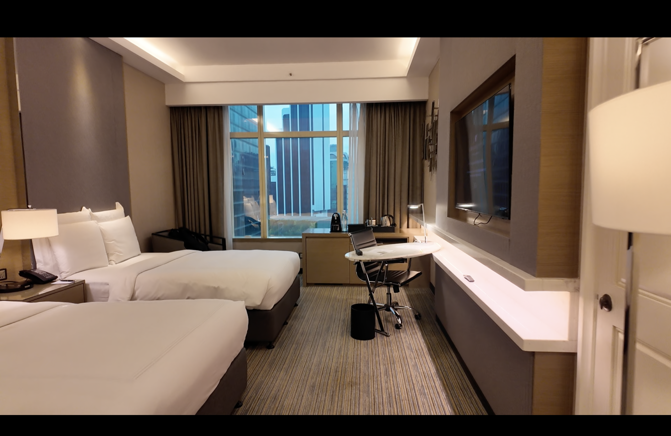 今回はツインタイプのお部屋に2泊しました。プラチナエリート特典で高層階の21階にアップグレードいただきました。眺望はパビリオン側でしたが、パビリオンの騒音は一切聞こえずとても快適でした。お部屋自体は40㎡あり、とても広々としていました。改装もされているようで、全体的に清潔感も十分に感じました。