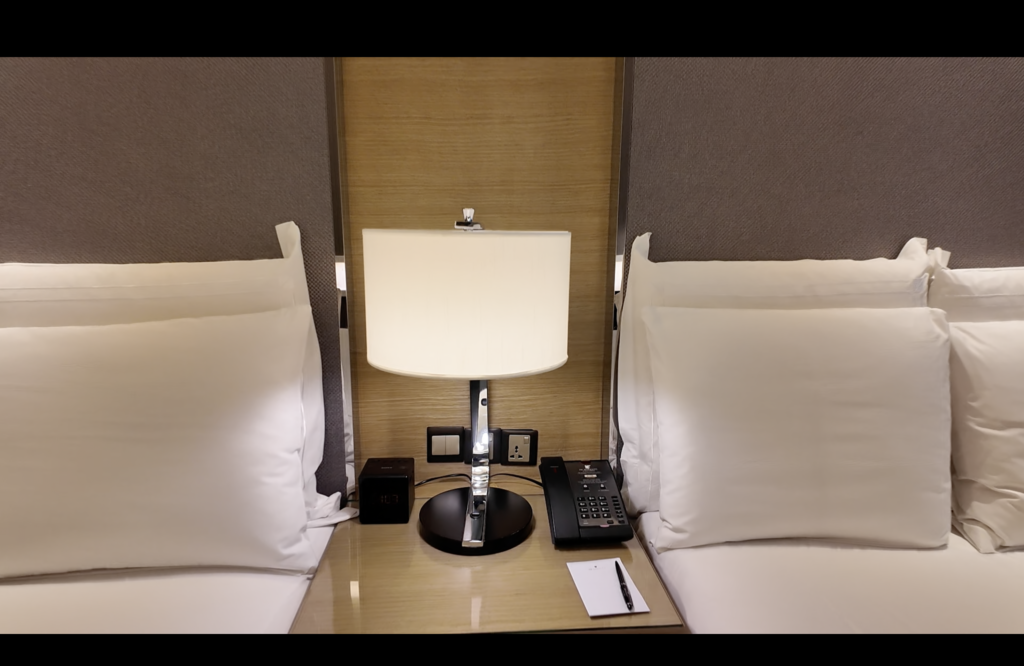 ベッド周りには日本のもので対応可能なコンセントが2口ありました。画像では隠れてしまっていますが、照明の後ろにもう一口コンセントがついていました。