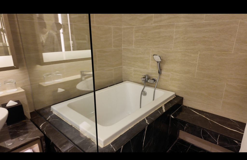 トイレ、バス、洗面台はこのような感じでした。トイレは個室にはなっておりませんでしたが、スペース自体はとても広く、不便さを感じることはありませんでした。バスルームはシャワールームと浴槽が隣り合わせになっていました。浴槽は少し小さめでした。また、シャワーは水圧が少し弱めだったのと、扉の隙間から水が漏れてしまい少し不便さを感じました。
