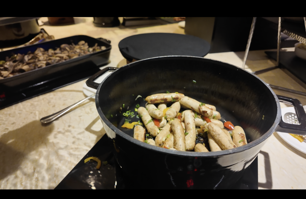 ホットミールにはソーセージにキノコのソテー、焼きそば、トマトベースの豆煮込みなどが用意されていました。